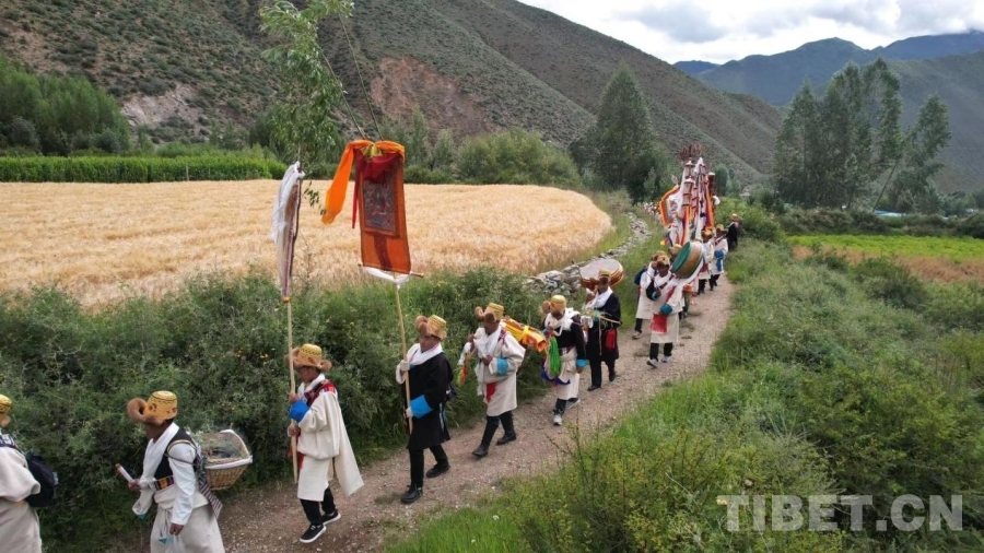 當(dāng)天清晨,村民們一大早身穿華麗的藏裝,頭戴“次仁金果”、高舉幡旗、身背經(jīng)書、手持青稞麥穗等作物,分成兩隊(duì)從村口出發(fā),轉(zhuǎn)村里的每一塊農(nóng)田進(jìn)行“收斂地氣、祈求豐收”的巡游活動(dòng)。浩浩蕩蕩的隊(duì)伍傾村而出,大家以不同的口號(hào)與詠唱,祈求風(fēng)調(diào)雨順,國(guó)泰民安。