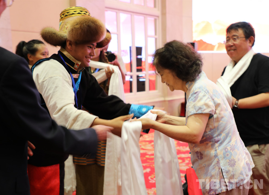 圖為西藏科技專干向北京建藏援藏工作者協(xié)會會員獻(xiàn)上哈達(dá) 攝影:王茜
