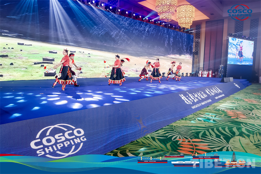 圖為洛隆縣藝術(shù)團(tuán)在中遠(yuǎn)海運特運2024全球合作伙伴大會上精彩亮相