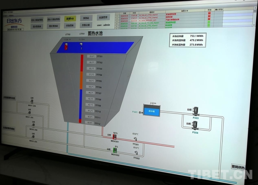 圖為運(yùn)行控制系統(tǒng)上可實時檢測蓄熱水池中各部分的水溫,平均溫度可達(dá)到60℃左右 攝影:王佳豪