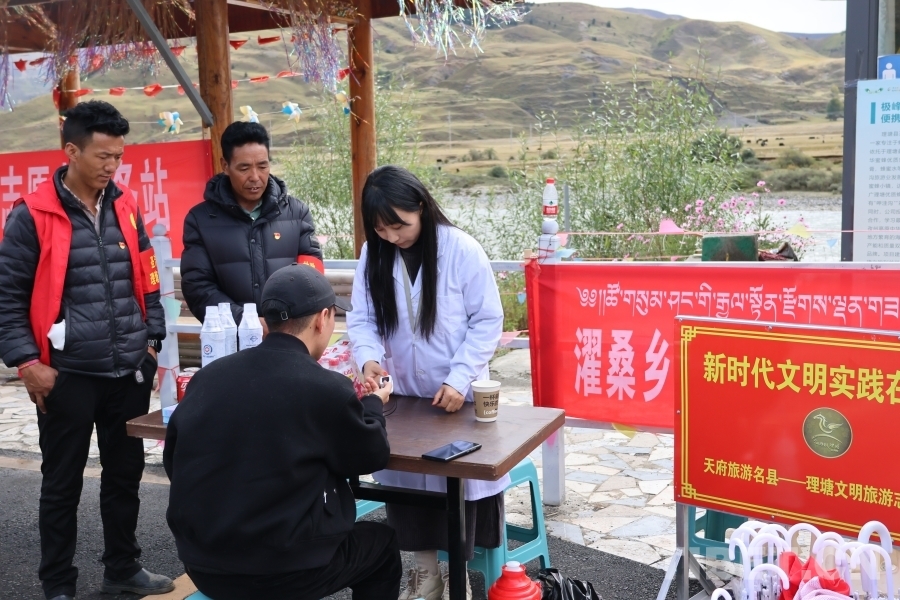 從海拔4700多米的卡子拉山,到一派田園風(fēng)光的濯桑片區(qū);從傳統(tǒng)文化氣息濃厚的勒通古鎮(zhèn),到一望無際的毛埡大草原,理塘縣共設(shè)立了19處新時(shí)代文明實(shí)踐旅游服務(wù)站,每處站點(diǎn)都配備了至少5名志愿者,從9點(diǎn)到18點(diǎn),全天提供指路問詢、文明旅游宣傳、血氧飽和度測量以及免費(fèi)開水、免費(fèi)雨傘、應(yīng)急充電等志愿服務(wù),并協(xié)助交警開展交通安全宣傳、文明行車引導(dǎo)等工作。