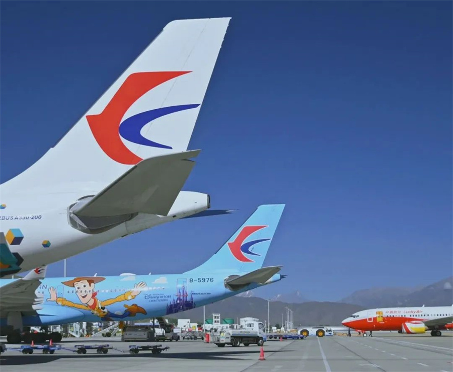 圖為拉薩貢嘎國(guó)際機(jī)場(chǎng)機(jī)坪保障現(xiàn)場(chǎng)