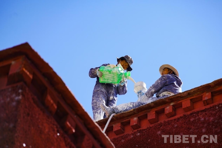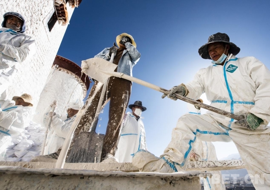 布達(dá)拉宮外墻粉刷一般持續(xù)7-10天,要在藏歷的9月22日之前全部完成。此刻,拉薩的雨季剛剛結(jié)束,冬季的寒冷結(jié)冰尚未到來,每年大家都趕在入冬之前完成這一浩大的粉刷工程。