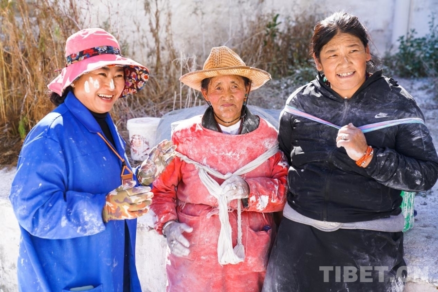 “布達(dá)拉宮外墻的白色涂料主體是來源于拉薩市當(dāng)雄縣羊八井和日喀則市仁布縣一帶的高嶺土,也就是我們通常所說的白灰。為了保證涂料的黏性和光澤度,在白灰兌上水后,我們會加入牛奶、白糖、牛骨膠、植物膠等配料。這些配比都是由長期從事布達(dá)拉宮文物保護(hù)的工匠來操作的,每種原材料的比例都是經(jīng)過匠人們長期的經(jīng)驗(yàn)積累所總結(jié)出的最佳配比方案。我們經(jīng)常會遇到群眾在幫忙的過程中在配比好的涂料中加入自己隨身攜帶來的牛奶等物,我們能夠理解群眾善良質(zhì)樸的心情,但其實(shí)改變了涂料配比后原有的黏度、光澤度都會改變,是不利于文物保護(hù)的?!边叞铜傔_(dá)說布達(dá)拉宮管理處每年都會在粉刷季向群眾和游客科普文物保護(hù)知識,希望群眾和游客在參與粉刷之時(shí)能夠遵守秩序,共同保護(hù)好這一文化遺產(chǎn)。