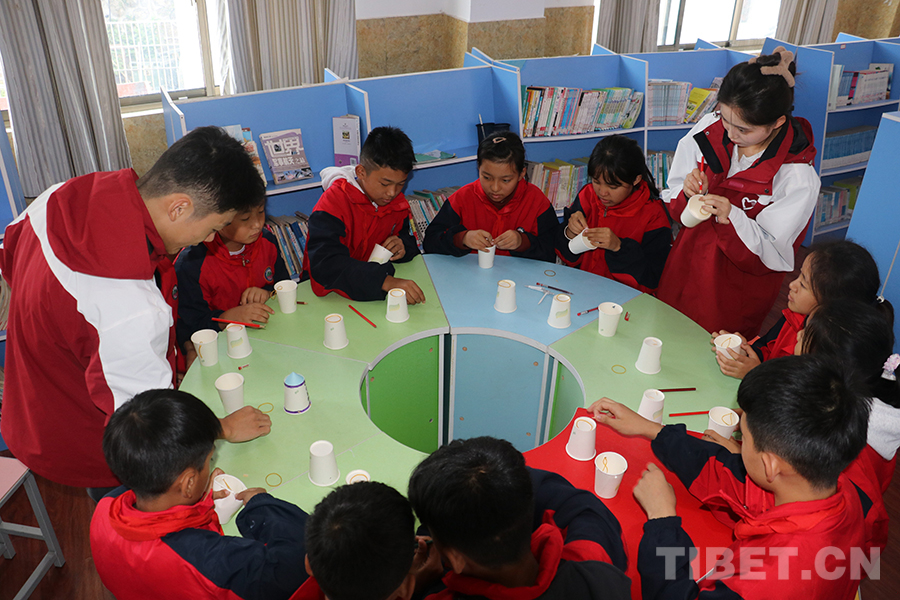 圖為志愿者帶領(lǐng)學(xué)生制作模型