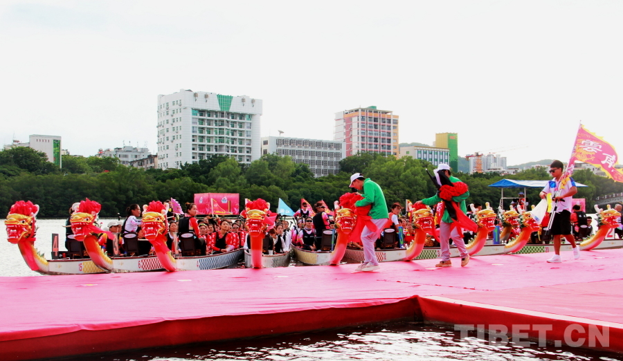 賽前,在龍舟巡游活動(dòng)后,國(guó)家民委副主任郭衛(wèi)平,海南省委常委、宣傳部部長(zhǎng)王斌,香港代表團(tuán)顧問(wèn)、中國(guó)香港體育協(xié)會(huì)暨奧林匹克委員會(huì)會(huì)長(zhǎng)霍震霆,香港代表團(tuán)團(tuán)長(zhǎng),香港文化體育及旅游局體育專員蔡健斌,國(guó)家民委文化宣傳司司長(zhǎng)張謀,國(guó)家民委港澳臺(tái)辦公室主任魏國(guó)雄,海南省政府副秘書(shū)長(zhǎng)國(guó)章成,國(guó)家民委文化宣傳司副司長(zhǎng)張劍輝,國(guó)家民委港澳臺(tái)辦公室副主任趙靜,海南省民委副主任黎梁東,海南省旅文廳副廳長(zhǎng)王忠云,海南省三亞市政府副市長(zhǎng)張長(zhǎng)豐為龍舟點(diǎn)睛、披紅,將比賽氛圍烘托得格外喜慶熱烈。