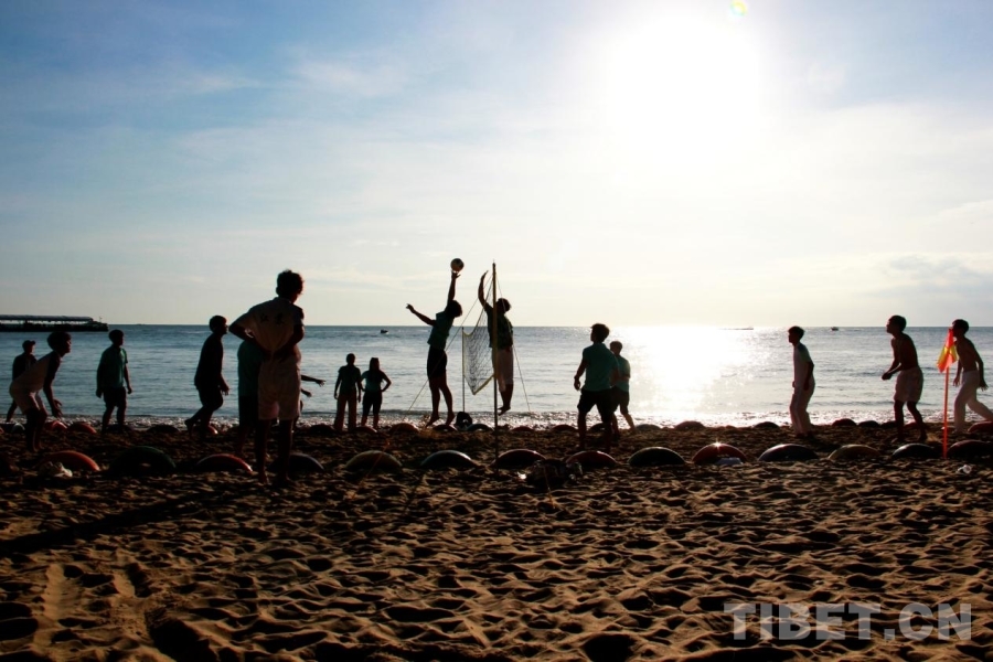 圖為第十二屆全國少數民族傳統(tǒng)體育運動會民族大聯(lián)歡活動現(xiàn)場,各代表團運動員們感受沙灘排球 攝影:劉莉