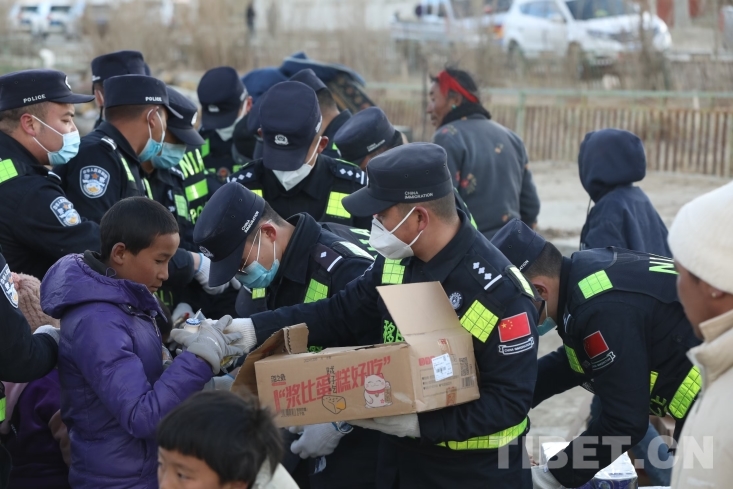圖為西藏移民管理警察為受災群眾發(fā)放食物 攝影:郭遠敬