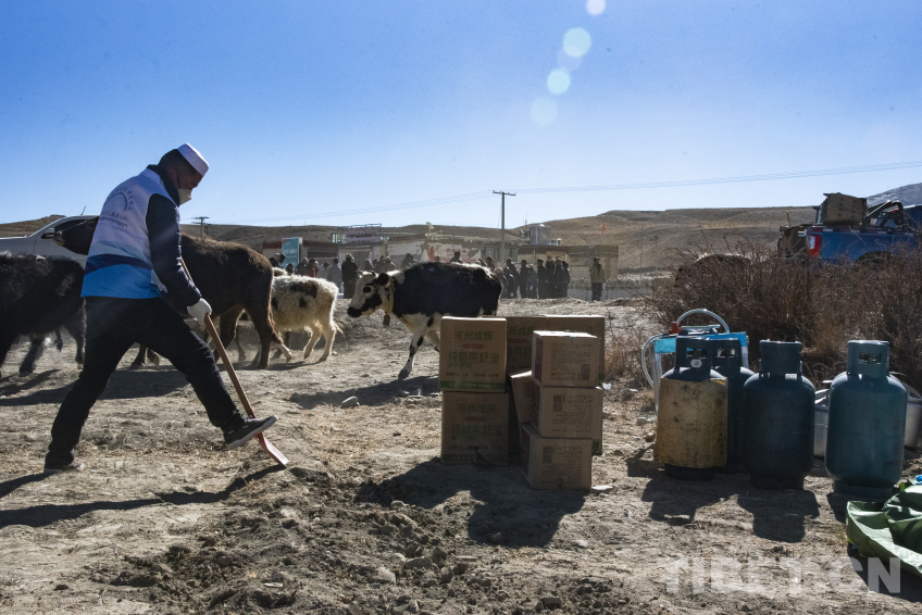 圖為在左措村地震安置點現(xiàn)場,山南市乃東區(qū)甘肅青海企業(yè)家商會愛心人士正在平整土地準(zhǔn)備為受災(zāi)群眾做飯 攝影:趙振宇