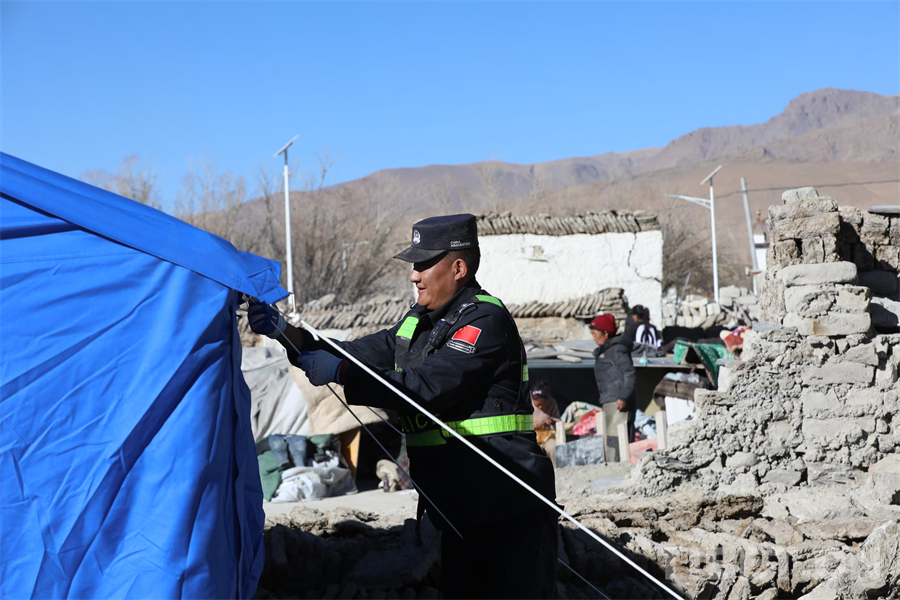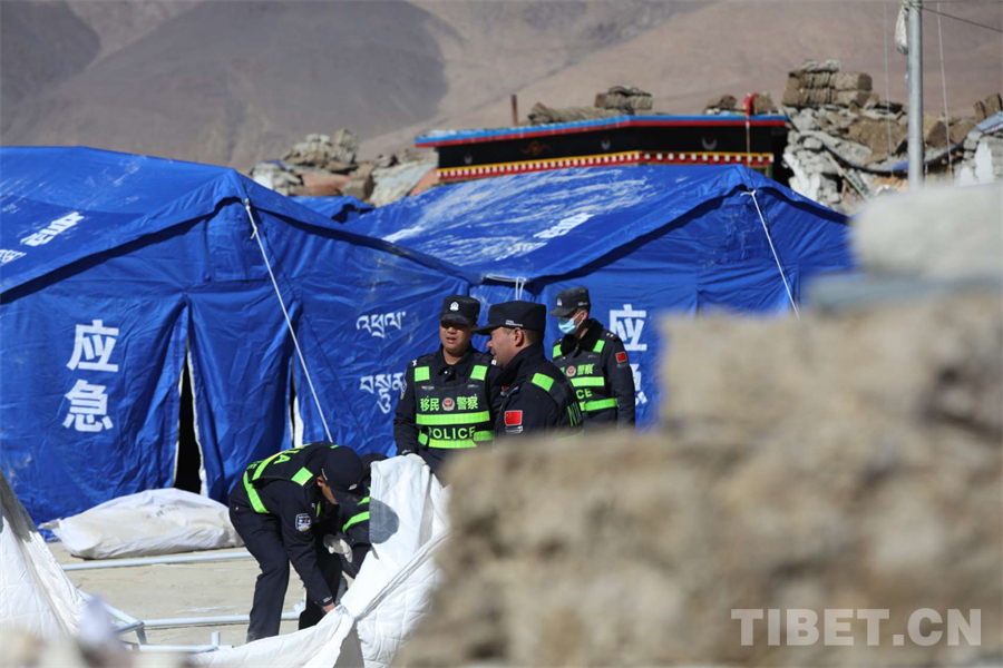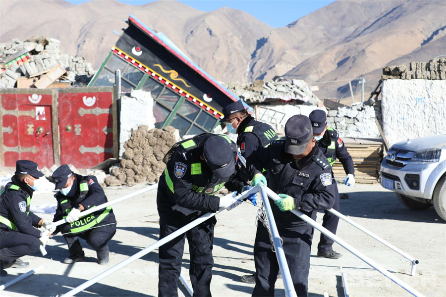 圖為西藏移民管理警察在定日縣長所鄉(xiāng)雜村為受災(zāi)群眾安裝帳篷 攝影:郭遠敬