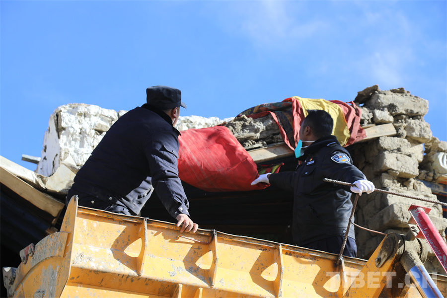 圖為仁布縣公安民警在定日縣曲洛鄉(xiāng)措昂村搬運(yùn)救援物資 攝影:旦增