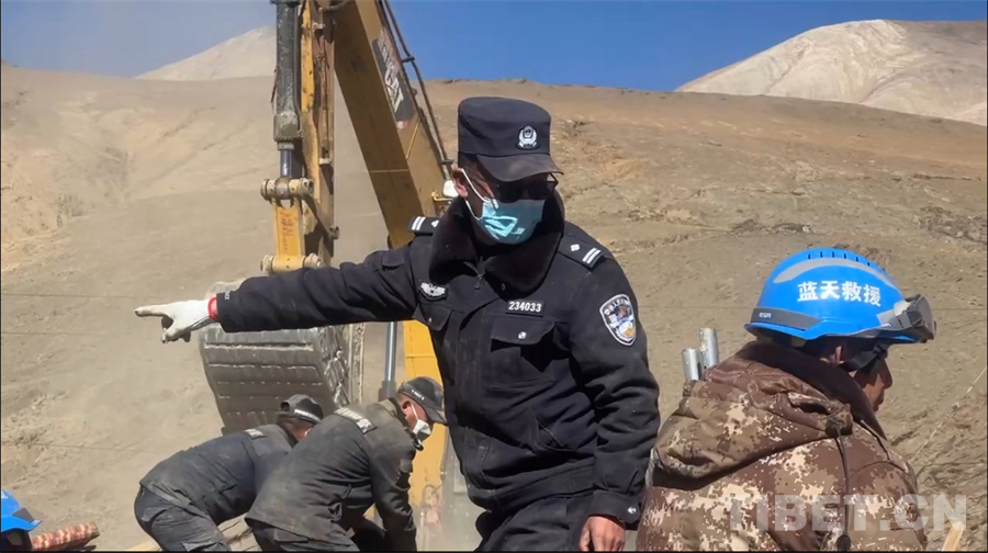 圖為拉孜縣公安民警在土林村開展救援工作 攝影:格桑羅布