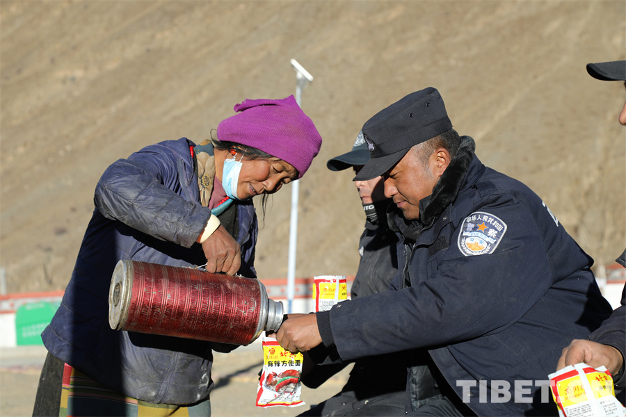 圖為拉孜縣震區(qū)群眾為一線民警倒水泡面 攝影:格桑羅布