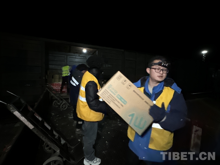 圖為首趟抗震救災(zāi)物資專列抵達(dá)日喀則,工作人員爭(zhēng)分奪秒進(jìn)行物資搶卸轉(zhuǎn)運(yùn) 攝影:周悅翔 馬生明