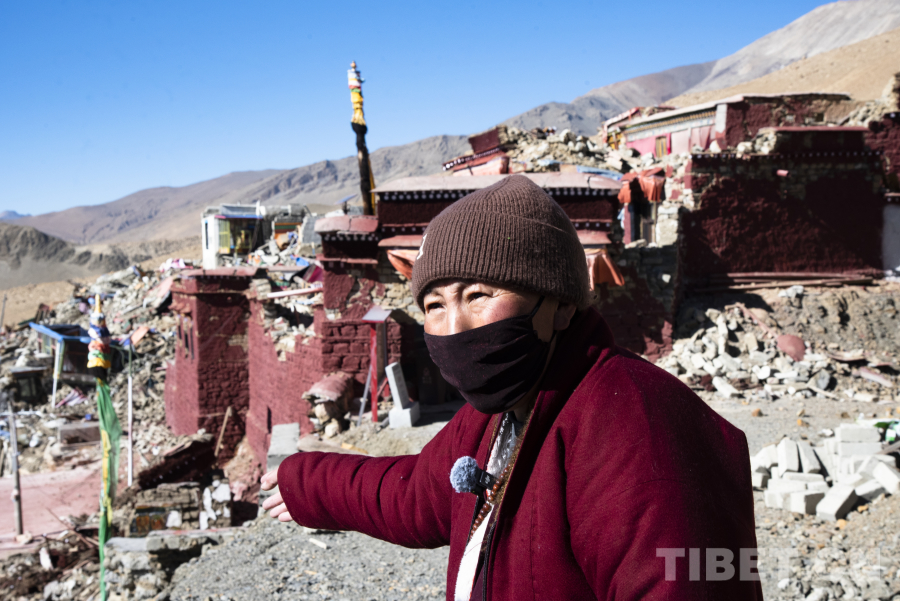 “地震發(fā)生時(shí)我們正在大殿誦經(jīng),撤離到安全地點(diǎn)對(duì)寺內(nèi)僧人清點(diǎn)核查無(wú)誤后,我們發(fā)現(xiàn)對(duì)面的宗布寺好像和以前很不一樣,我們就立即和趕到這里幫助我們的統(tǒng)戰(zhàn)干部、駐寺干部、駐寺民警以及附近的群眾一起往宗布寺趕,趕到宗布寺時(shí)是10點(diǎn)40?!鄙虑滤鹿芾砦瘑T會(huì)副主任阿旺次仁用手指向?qū)γ嫔缴系淖诓妓?,可以清晰地看到寺廟發(fā)生嚴(yán)重坍塌。