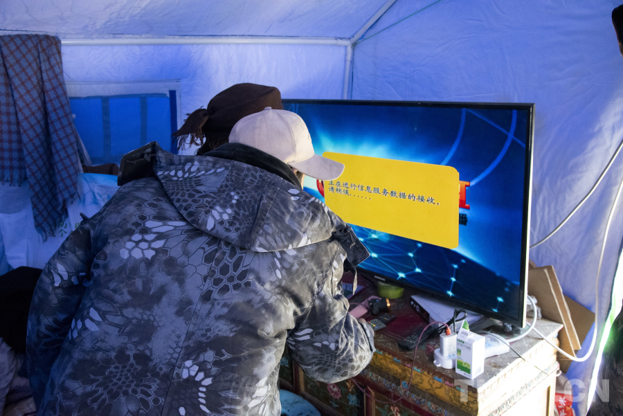 圖為楚卡村安置點(diǎn)村民正在帳篷內(nèi)調(diào)試電視機(jī) 攝影:趙振宇