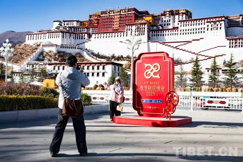 圖為游客在央視春晚西藏拉薩分會場標(biāo)識前打卡 攝影:趙振宇