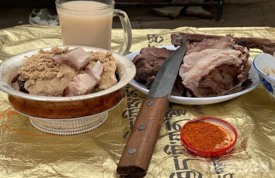 到了中午,我們會(huì)邀請(qǐng)鄰里親戚來(lái)家里做客,除了準(zhǔn)備米飯蔬菜,在牧區(qū),主人家還會(huì)煮牛羊的頭來(lái)招待客人。大人們都愛(ài)吃肉,年輕人都喜歡吃各類蔬菜。到了下午,我們就會(huì)吃人參果拌酥油,還有肉包子。