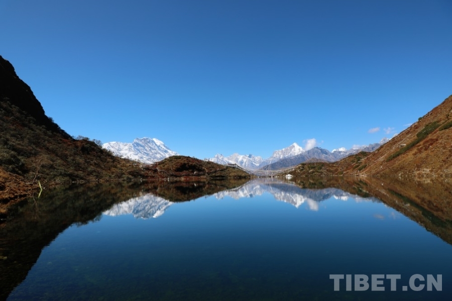 湖水清澈見底,倒映著雪山與天空,