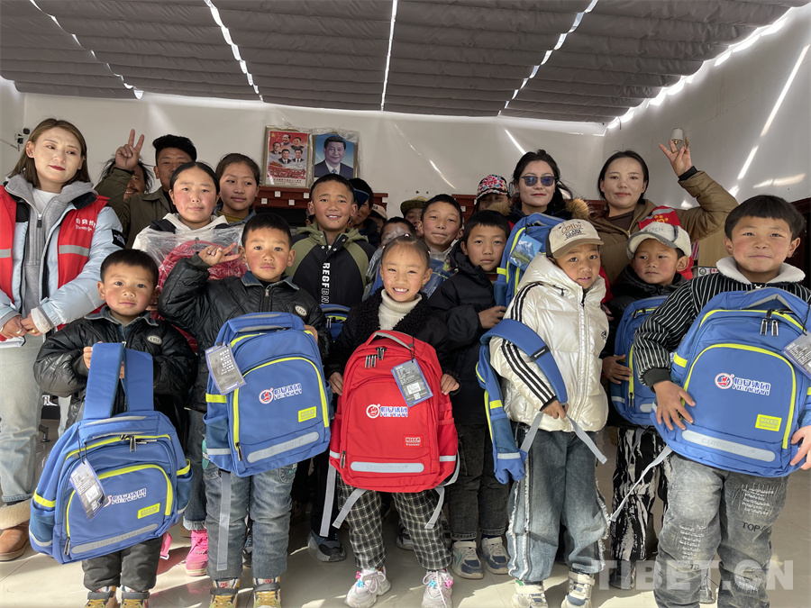 圖為西藏洛隆縣組織志愿者們?yōu)楹⒆觽冑?zèng)送學(xué)習(xí)用具