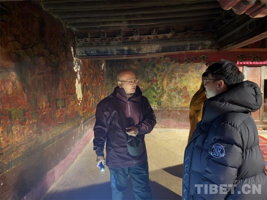 圖為羅文華在薩迦寺內(nèi)認(rèn)真測(cè)繪 攝影:王妍丹