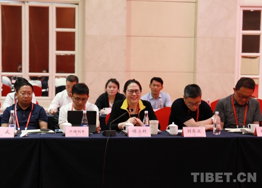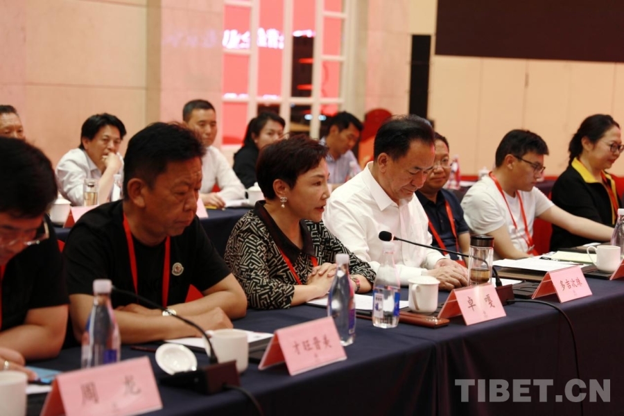 圖為西藏自治區(qū)政協(xié)黨組成員、副主席、區(qū)工商聯(lián)主席、總商會會長多吉次珠(前排左三)發(fā)言 攝影:劉莉
