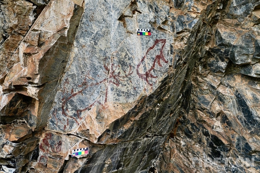 圖為2023年6月24日拍攝的甘孜州“海子山-格聶巖畫群”海1巖畫中獨(dú)特的野豬、人物、爪印圖像
