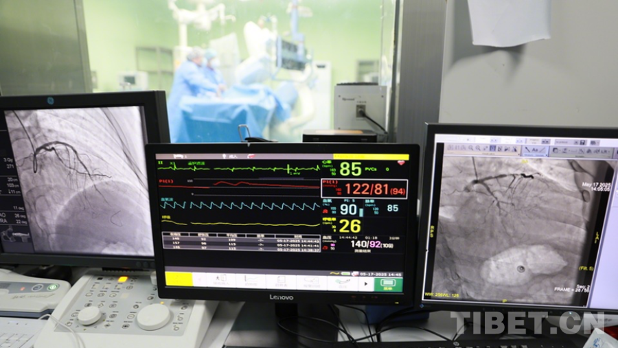 圖為陰赪茜(手術(shù)室內(nèi)右)趕赴阿壩州人民醫(yī)院手術(shù)救治急性心梗患者,通過比對(duì)屏幕上的畫面,術(shù)后(左側(cè)屏幕)患者的心臟血管血流已較術(shù)前明顯恢復(fù) 攝影:劉莉