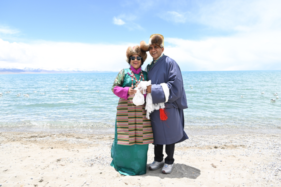 圖為尼泊爾駐拉薩總領事拉克西米·普拉薩德·尼羅拉夫婦在湖邊合影 攝影:旦曲