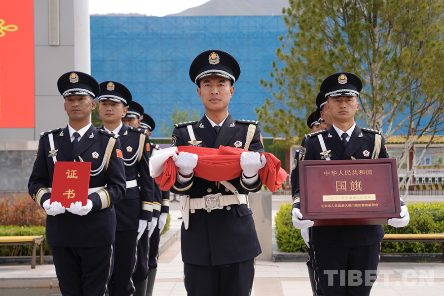 圖為國旗護(hù)衛(wèi)隊(duì)護(hù)送國旗至昌都市革命歷史博物館 攝影:群旦次仁