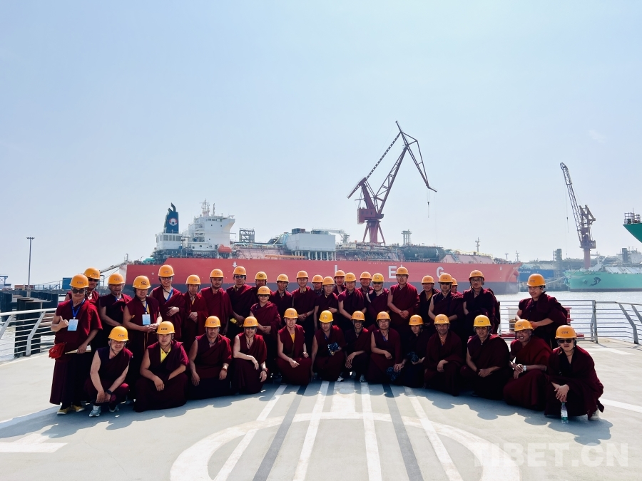 圖為西藏佛學(xué)院師生在上海江南造船廠(chǎng)合影,近距離接觸中國(guó)制造的先進(jìn)液化乙烯(LEG)運(yùn)輸船 攝影:趙振宇