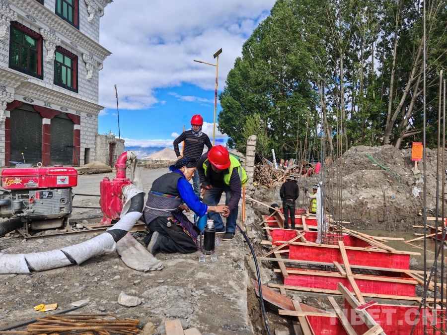 在仲康村巴桑家的重建工地上,工程已進(jìn)入鋼筋捆扎階段。一場(chǎng)突如其來的夜雨導(dǎo)致基坑積水。清晨七八點(diǎn),施工隊(duì)員已在基坑中忙碌開來,有的加緊捆扎鋼筋,有的尋找水泵抽水。日頭漸高,汗水浸濕了工人們的額頭,他們卻無暇休息。這時(shí),阿媽巴桑提著一壺剛煮好的甜茶走來,就地一杯杯沏好,熱情地招呼這群“小伙子”。“以前的老房子震壞了,現(xiàn)在黨和政府給我們建更好的新房子,日子肯定越過越有盼頭!”樸實(shí)的話語里,滿是她對(duì)未來的憧憬和對(duì)援助的感激。