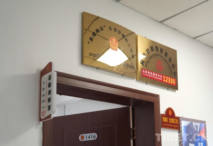 圖為阿里地區(qū)中級(jí)人民法院的溫馨調(diào)解室及“象雄梅朵”女法官維權(quán)工作站牌匾 攝影:邊子捷