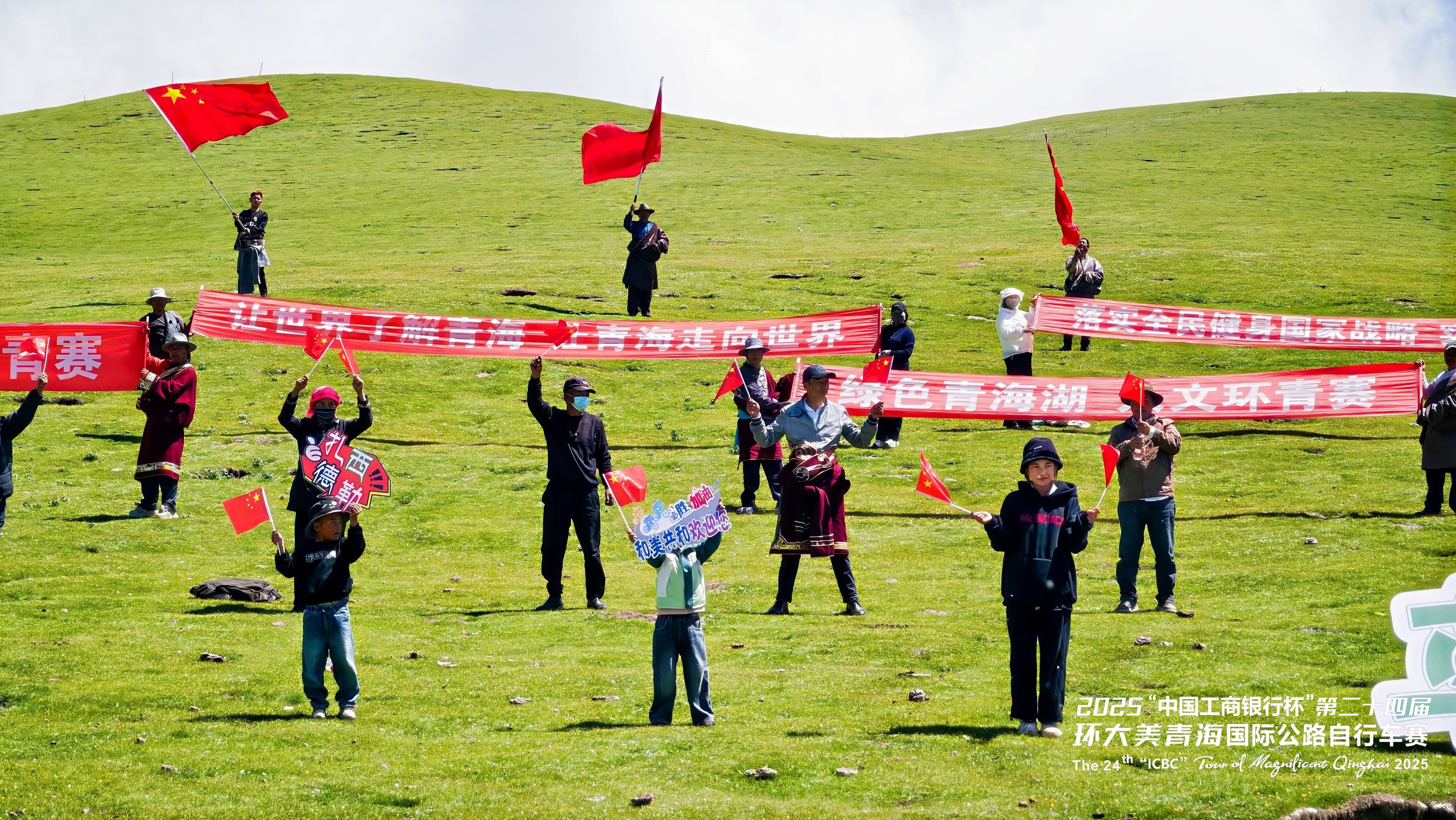 圖為環(huán)青賽期間,沿途的群眾、小朋友們手持“讓世界了解青海 讓青海走向世界”“綠色青海湖 人文環(huán)青賽”等標(biāo)語(yǔ)的橫幅,用燦爛的笑容和真摯的歡呼,向世界展示著青海人民的開放與好客,飄揚(yáng)的橫幅與歡呼聲交織,傳遞出這片土地對(duì)八方來客最熱烈的歡迎。