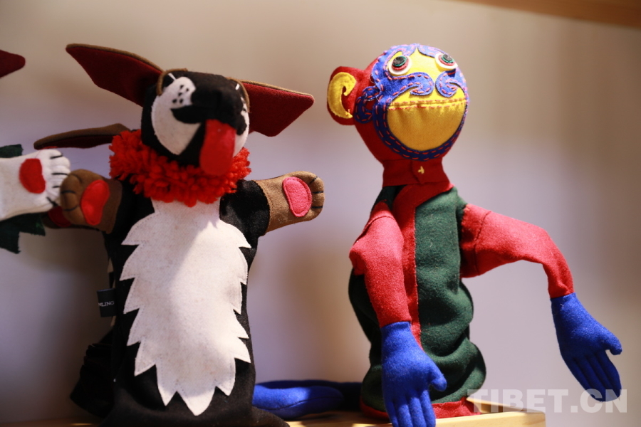 圖為夏扎大院里的“卓番林·措瓦”店陳列的手工十二生肖系列手偶狗與猴 攝影:劉莉