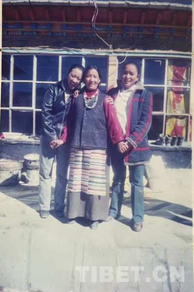 這是在我們家老房子門口照的。那時候全是土坯房,這間是四間房里最大的。大概是1990年左右。記得穿的這身衣服那些年很多人都穿,應(yīng)該是軍裝,穿著這衣服騎馬去挖藥很多次。人民公社時期我們有八個生產(chǎn)隊,那時候要采藥掙工分,偶爾拉薩藏醫(yī)院的老師們會專程來札達,我們也要幫忙去采藥。這邊藥材很多,如雪蓮花、黃連、蒂丁等。拍這張照片時孩子的鞋和幾件衣服是我自己織的,但要買好衣服還得去阿里地區(qū)。那時我丈夫已經(jīng)在開車,我們家條件稍好些,但也不是村里最好的。