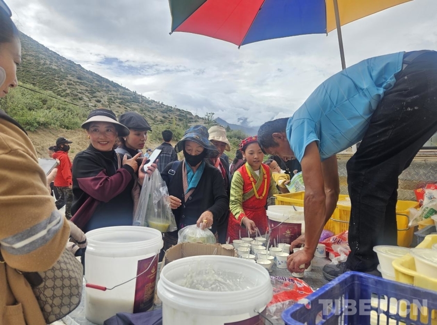 圖為前往色拉寺觀看展佛的民眾品嘗酸奶 攝影:胡青