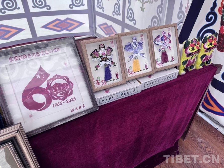 圖為南木林縣慶祝西藏自治區(qū)成立60周年文藝匯演現(xiàn)場所展示的剪紙和濰坊風(fēng)箏