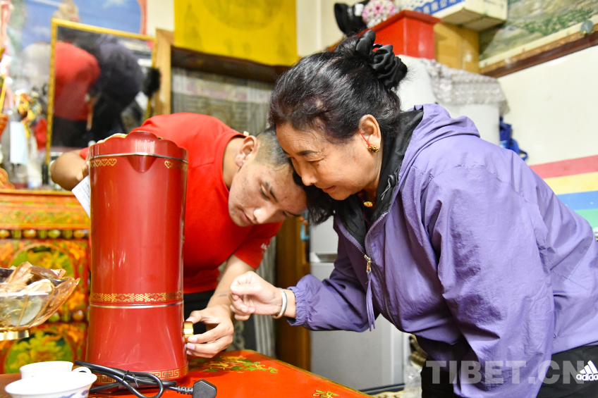 圖為卓嘎與兒子羅布次仁一起仔細(xì)研究這一臺全自動酥油茶壺的使用 攝影:趙振宇