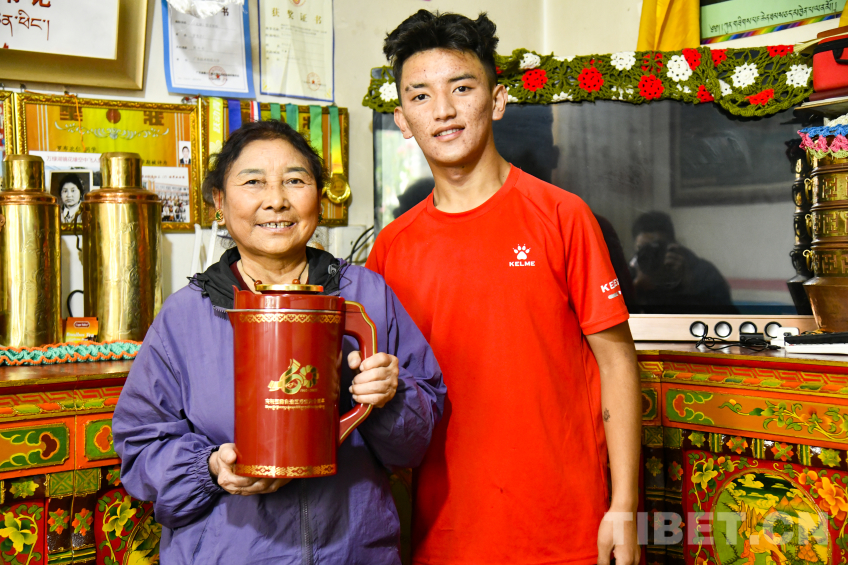 圖為羅布次仁為母親卓嘎倒上第一杯酥油茶,這對茶杯是西藏自治區(qū)成立50周年中央代表團(tuán)贈送的禮物 攝影:趙振宇