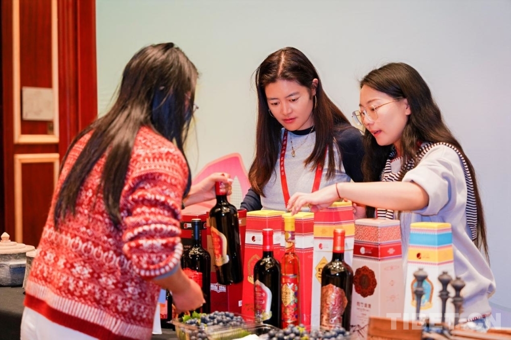 圖為工作人員為現(xiàn)場(chǎng)嘉賓介紹桑日帕竹紅酒