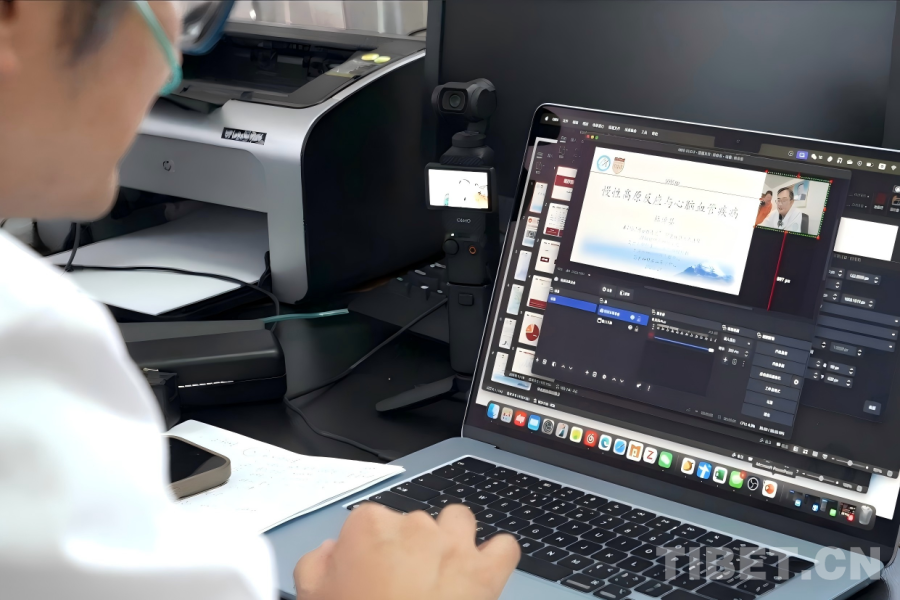 在阿里地區(qū)人民醫(yī)院的行政樓辦公室內(nèi),來自上海華山醫(yī)院神經(jīng)外科、作為第25批“博士服務(wù)團(tuán)”成員援藏的主治醫(yī)師杜倬嬰,正專注研究一項(xiàng)“新技術(shù)”。桌面上,一臺口袋相機(jī)運(yùn)行著,旁邊電腦屏幕上同步顯示相機(jī)所拍攝的畫面,同時呈現(xiàn)的還有一份關(guān)于高原反應(yīng)與心腦血管疾病的課程講義?!斑@是一套直播系統(tǒng),不過我現(xiàn)在還在學(xué)習(xí)怎么使用?!爆F(xiàn)任阿里地區(qū)人民醫(yī)院黨委委員、副院長的杜倬嬰笑著展示初見雛形的成果。