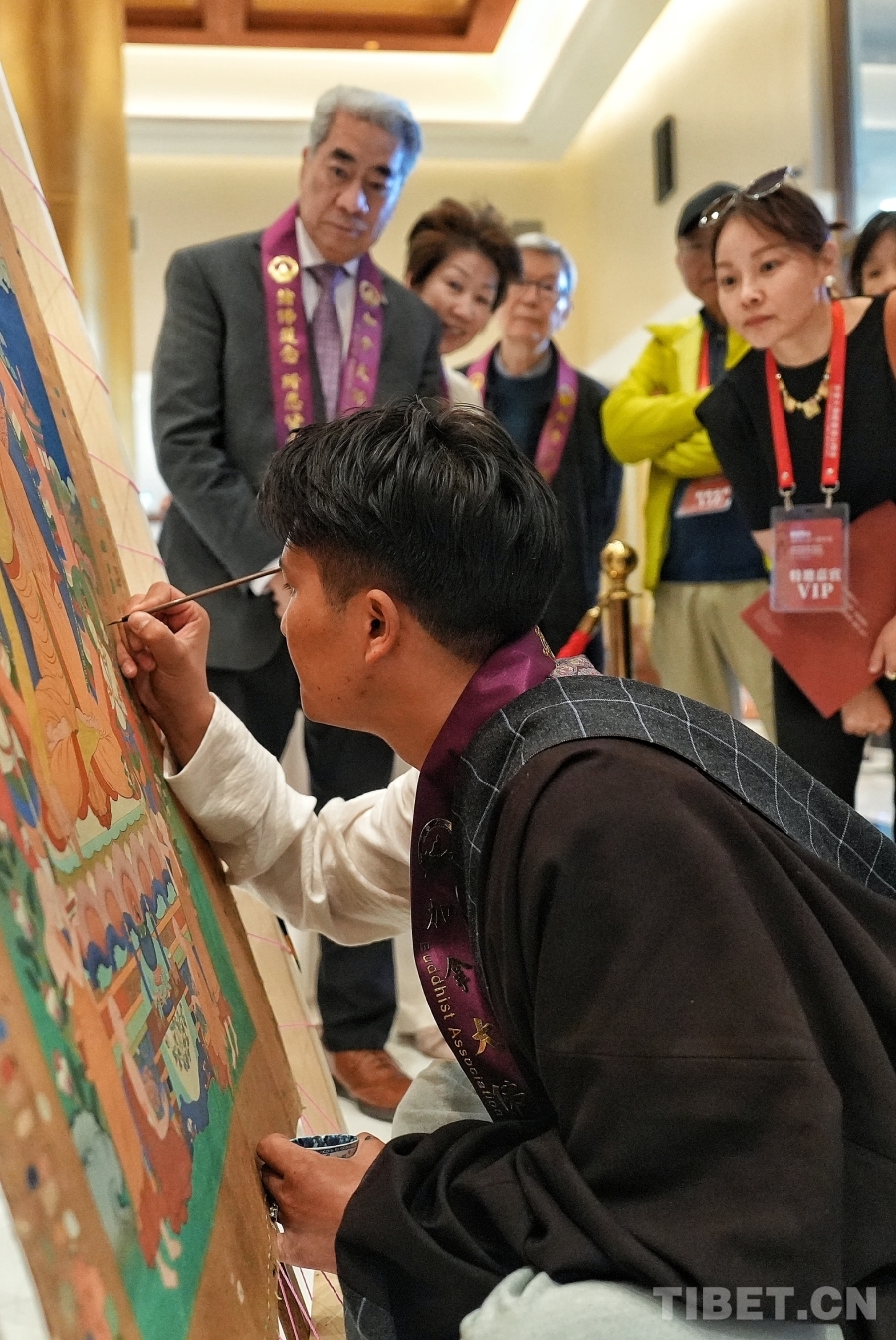 為了提升觀展體驗(yàn),展覽特別設(shè)置了“唐卡技藝現(xiàn)場演示”環(huán)節(jié)。壤巴拉非遺傳習(xí)協(xié)會青年藝術(shù)家申支足現(xiàn)場展示傳統(tǒng)唐卡繪制過程,他專注而細(xì)膩的筆觸,讓觀眾得以近距離觀察到非遺技藝的“匠心細(xì)節(jié)”,直觀感受每一幅作品背后所沉淀的時(shí)間與文化心血,從而更深入地理解中國優(yōu)秀傳統(tǒng)藝術(shù)的創(chuàng)作邏輯。