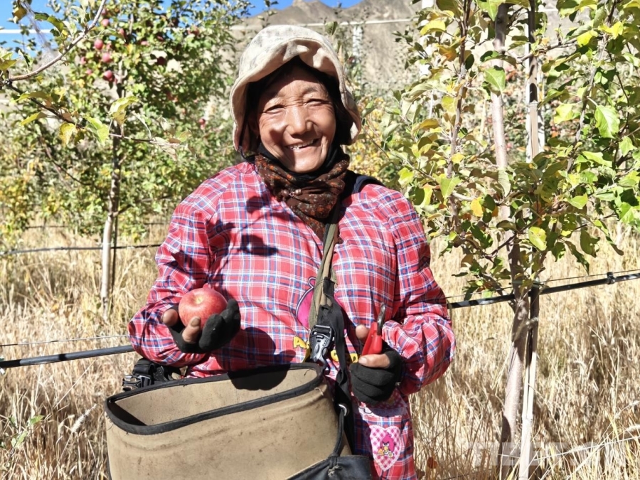 圖為山南市貢嘎縣吉雄鎮(zhèn)劉瓊村的村民次尼在貢嘎縣矮化蘋果種植項目基地,向記者鏡頭展示其在家門口就業(yè)的喜悅之情