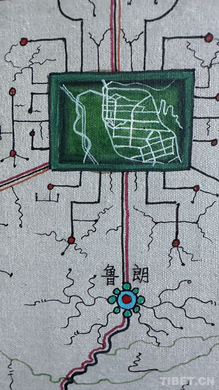 創(chuàng)作過程中最大的困難是如何藝術(shù)地表現(xiàn)公路網(wǎng)絡(luò)?!拔彝ㄟ^分析現(xiàn)代地圖、衛(wèi)星導(dǎo)航、古代寶藏圖和手繪地圖,發(fā)現(xiàn)西藏公路是順應(yīng)地貌修建的。”達(dá)布描述著他的發(fā)現(xiàn),“沿著河流,一條河有幾個(gè)分支就有幾條路;沿著山谷,一個(gè)大山谷有幾個(gè)小山溝就有幾條路。俯看就像一棵大樹,又像是電腦芯片,一條主干道邊上分出無數(shù)支線。”