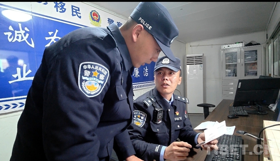 圖為王啟明將檢查完畢的證件遞還給游客,劉建宏在一旁學(xué)習(xí)