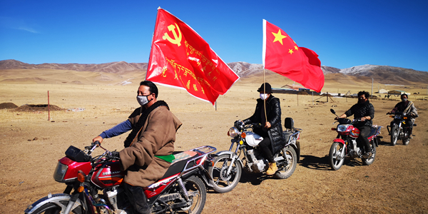 宣傳隊(duì)騎著摩托車(chē)在宣傳途中。(黃南州委組織部供圖)