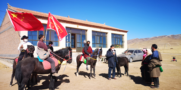 宣傳隊(duì)騎著馬開(kāi)展宣傳。(黃南州委組織部供圖)