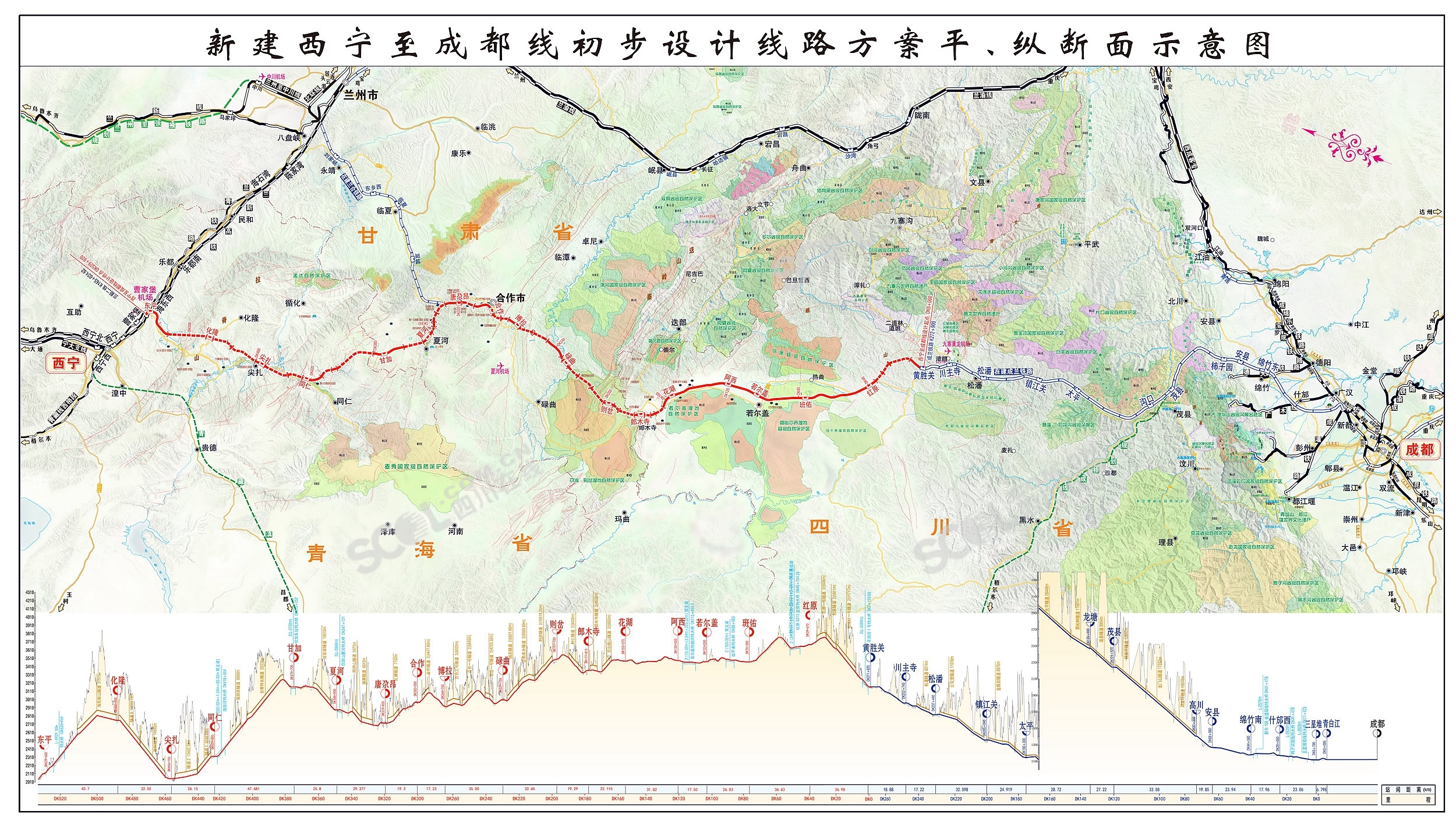 西寧至成都鐵路走行于青藏高原東部邊緣與黃土高原過渡地帶,全線海拔在2000米以上,四川省境內(nèi)段海拔均高于3000米,其中若爾蓋到松潘之間的越齡地帶軌面標高3760米,是全線海拔最高點。