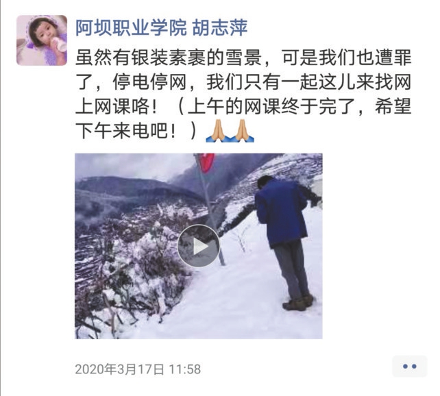 上完網(wǎng)課,胡志萍發(fā)了一條朋友圈感慨當(dāng)天的經(jīng)歷:“雖然有銀裝素裹的雪景,可是我們也遭罪了,停電停網(wǎng),我們只有一起到這兒來(lái)找網(wǎng)上網(wǎng)課咯!”而讓她沒(méi)想到的是,這條朋友圈隨后引發(fā)了一場(chǎng)愛(ài)心接力……